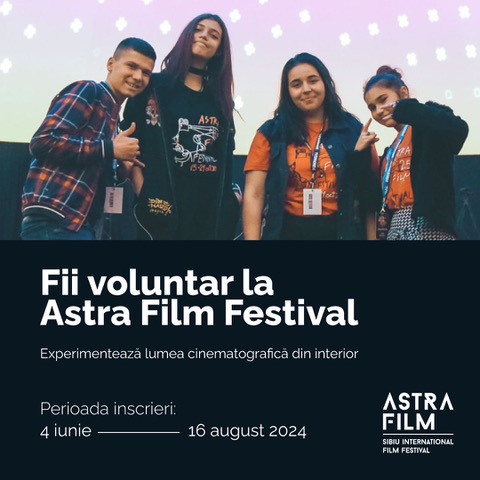 - Înscrierile se pot face în perioada 4 iunie – 19 august prin completarea unui formular disponibil pe site-ul festivalului: https://www.astrafilm.ro/voluntar/inscriere. În acest an, Astra Film Festival se va desfășura la Sibiu în perioada 20-27 octombrie 2024.