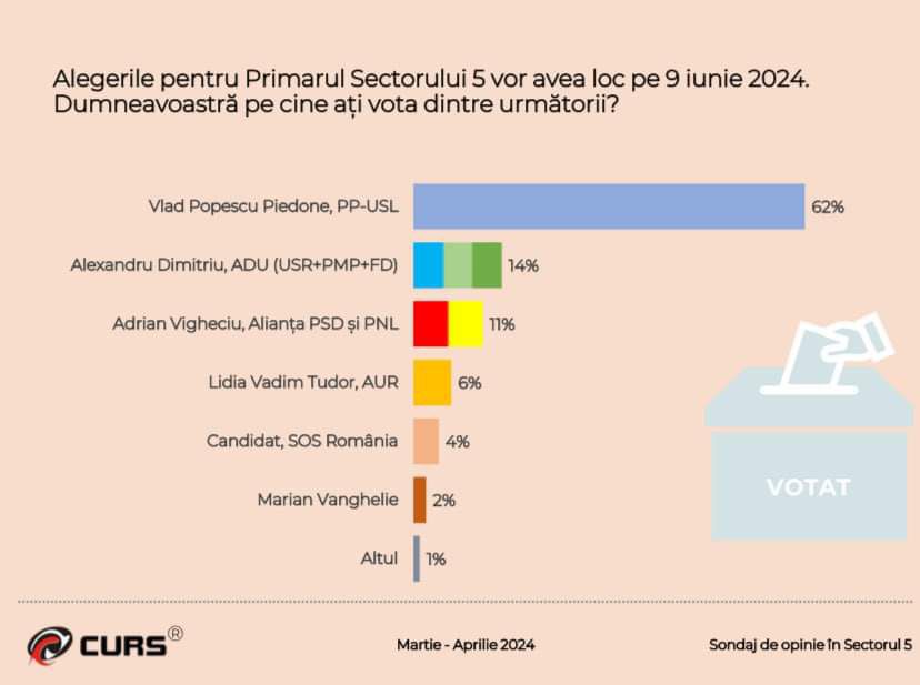 Un nou sondaj CURS realizat la nivel național în perioada 26 martie-2 aprilie, pe un eșantion de 1.067 respondenți, indică intenția de vot a românilor la alegerile locale şi europarlamentare. Sondajul arată că primarul Cristian Popescu Piedone este favorit la Primăria Capitalei iar fiul său, deputatul Vlad Popescu Piedone, la Sectorul 5.