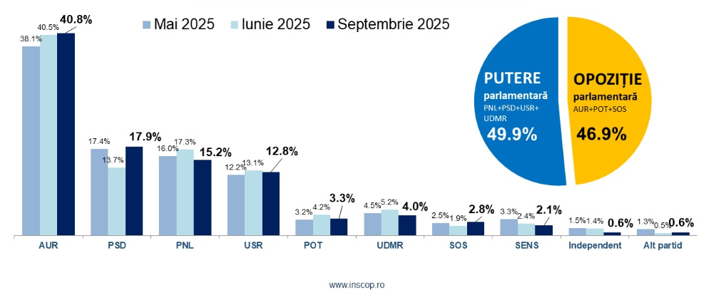 ”Prima măsurătoare sociologică din cadrul Barometrului INSCOP – Informat.ro realizată după încheierea vacanței arată consolidarea intenției de vot pentru AUR în jurul pragului de 40%. Se observă o ușoară creștere a intenției de vot pentru PSD, o ușoară scădere în cazul PNL și stagnare în cazul USR. Susținerea electorală cumulată pentru cele 4 partide ale coaliției guvernamentale (PSD, PNL, USR, UDMR) de aproape 50% este cu doar 3 procente mai mare decât susținerea electorală pentru partidele parlamentare din opoziție (AUR, POT și S.O.S.) de aproximativ 47%.