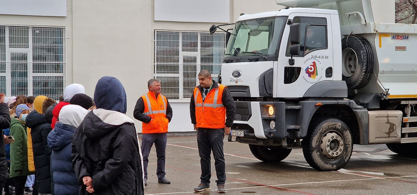 Specialiștii și utilajele de la Infrastructură 5, demonstrație LIVE pentru elevii Școlii Gimnaziale nr. 131 din Sectorul 5