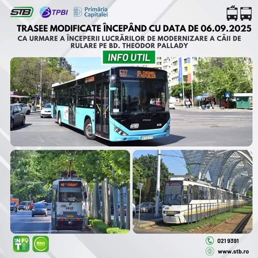 STB anunță că, având în vedere începerea lucrărilor de modernizare a căii de rulare a tramvaielor de pe Bd. Theodor Pallady din cadrul „LOTUL 1 – Reabilitare sistem rutier pe Bd. Th. Pallady, Bd. 1 Decembrie 1918, Bd. Basarabia, Calea Călărașilor, Bd. Corneliu Coposu, inclusiv Bucla Complex Titan”, începând cu data de 06.09.2025 se vor lua următoarele măsuri: