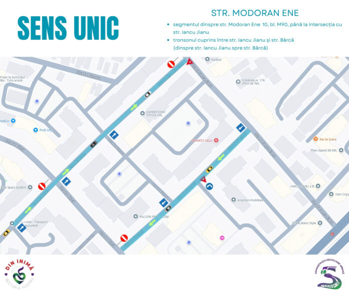 Administrația Dezvoltare Urbană Sector 5 informează că, începând cu data de 28 iulie 2025, circulația rutieră pe strada Modoran Ene se va desfășura în sens unic, dinspre str. Modoran Ene nr. 10, bl. M90, către intersecția cu strada Iancu Jianu.