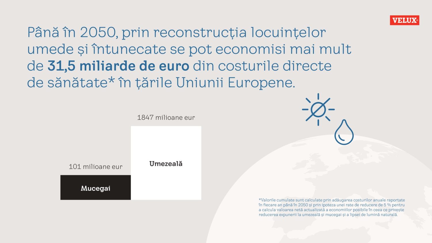 ”Potrivit studiului Velux, reducerea riscurilor climatice la interior prin renovarea corespunzătoare a clădirilor ar genera economii totale de peste 6,3 miliarde euro pentru România până în 2050, astfel: 801 milioane euro la cheltuielile cu asistenţa medicală, 425 milioane euro la sănătate şi productivitate, 2,4 miliarde de euro pentru şcoli şi 1,3 miliarde de euro, respectiv 1,4 miliarde de euro pentru birouri, datorită productivităţii crescute în imobile mai bine ventilate şi cu mai multă lumină naturală”, arată compania, într-un comunicat de presă.