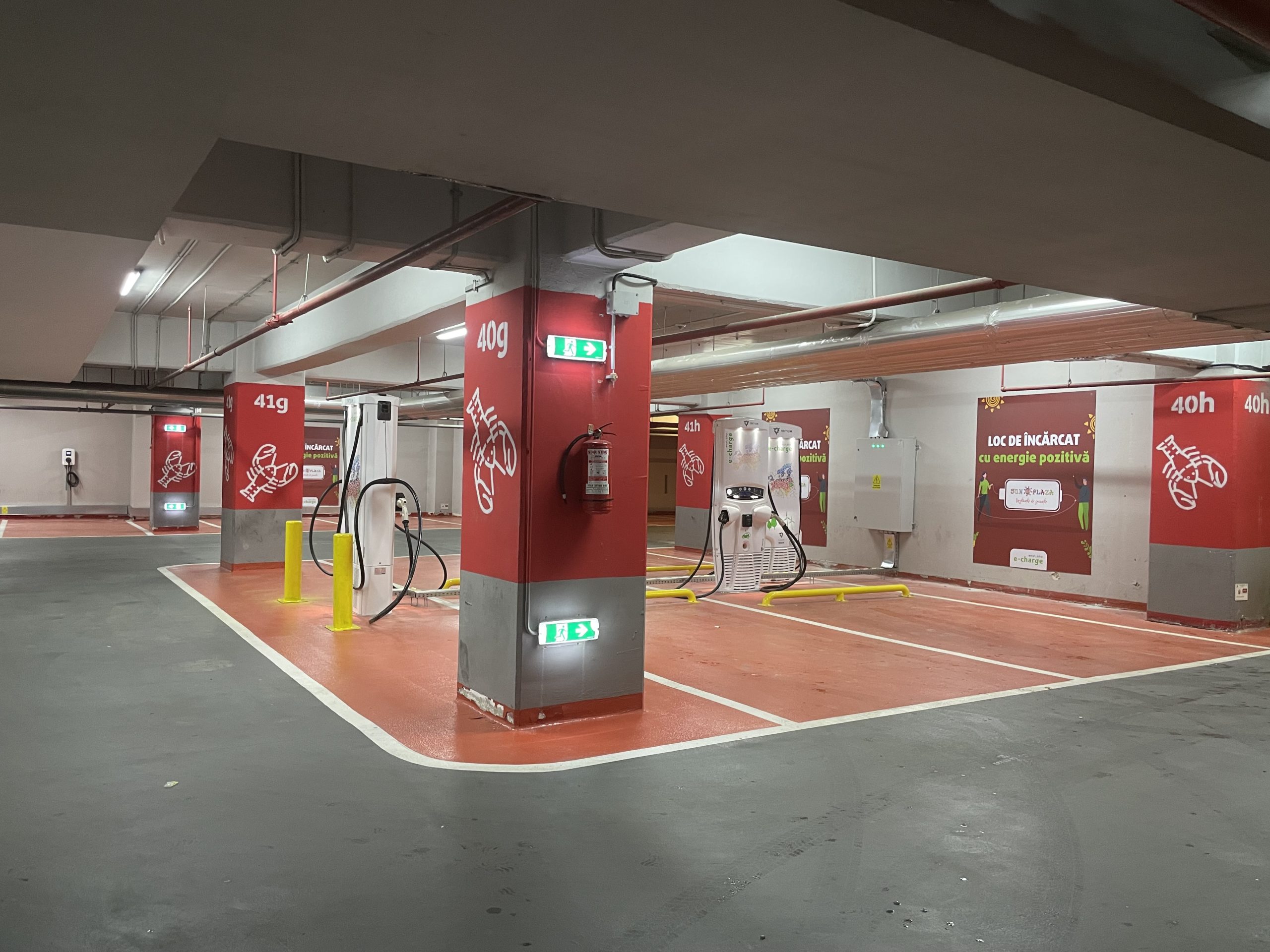 O altă premieră este stația e-charge de tip fast charge, ce poate încărca mașini cu o putere de până la 75kw, prima de acest gen dintr-un centru comercial.