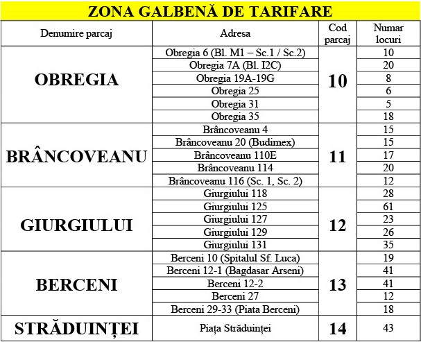 • Zona galbenă, tarifată cu 2 lei/oră, a fost creată în zonele cu trafic intens, pentru facilitarea accesului  la punctele de maxim interes pentru cetățeni (spitale, farmacii, sedii ale unor instituții publice etc.).