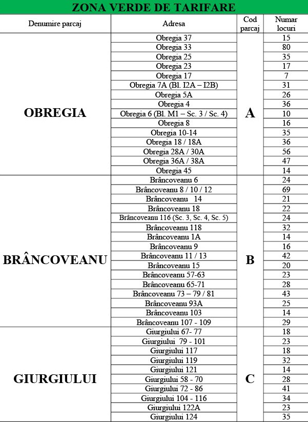 • Zona verde, tarifată cu 1 leu/două ore, este valabilă în locații în care fluxul de mașini este unul redus.