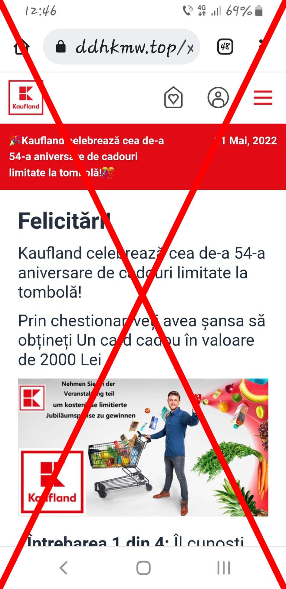 Kaufland România avertizează clienții în legătură cu o tentativă de fraudă prin intermediul unei false oferte online sub forma: „Kaufland celebrează cea de-a 54-a aniversare de cadouri limitate la tombolă!”.
