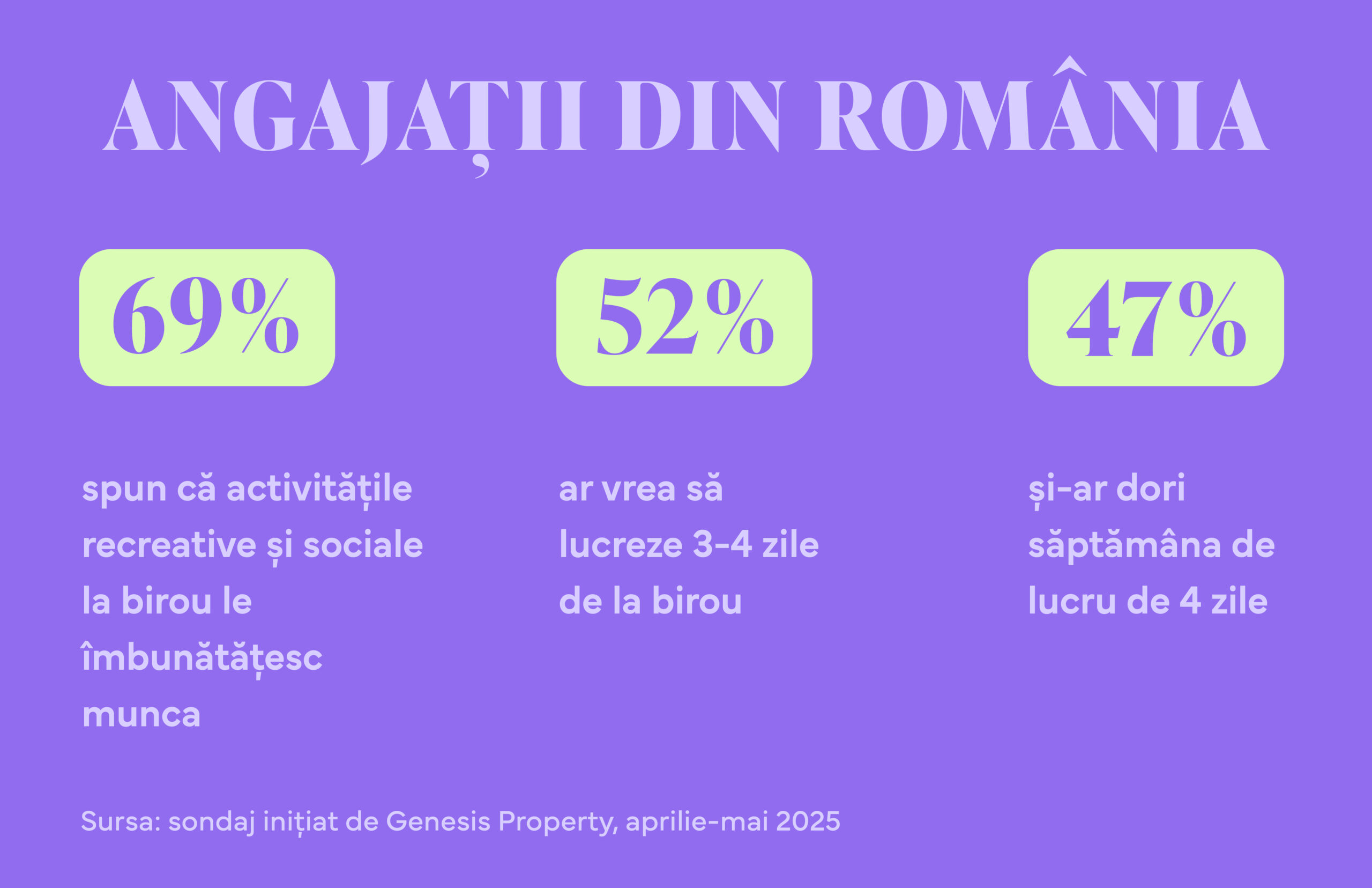 Aproape 47% dintre angajaţi şi-ar dori săptămâna de lucru de 4 zile. Peste jumătate vor să vină cel puţin 3-4 zile la birou, pentru activităţile recreative şi sociale care îi ajută să fie mai productivi, arată un sondaj Genesis Property realizat în aprilie-mai 2025, pe un eşantion de 1.012 respondenţi la nivel naţional.