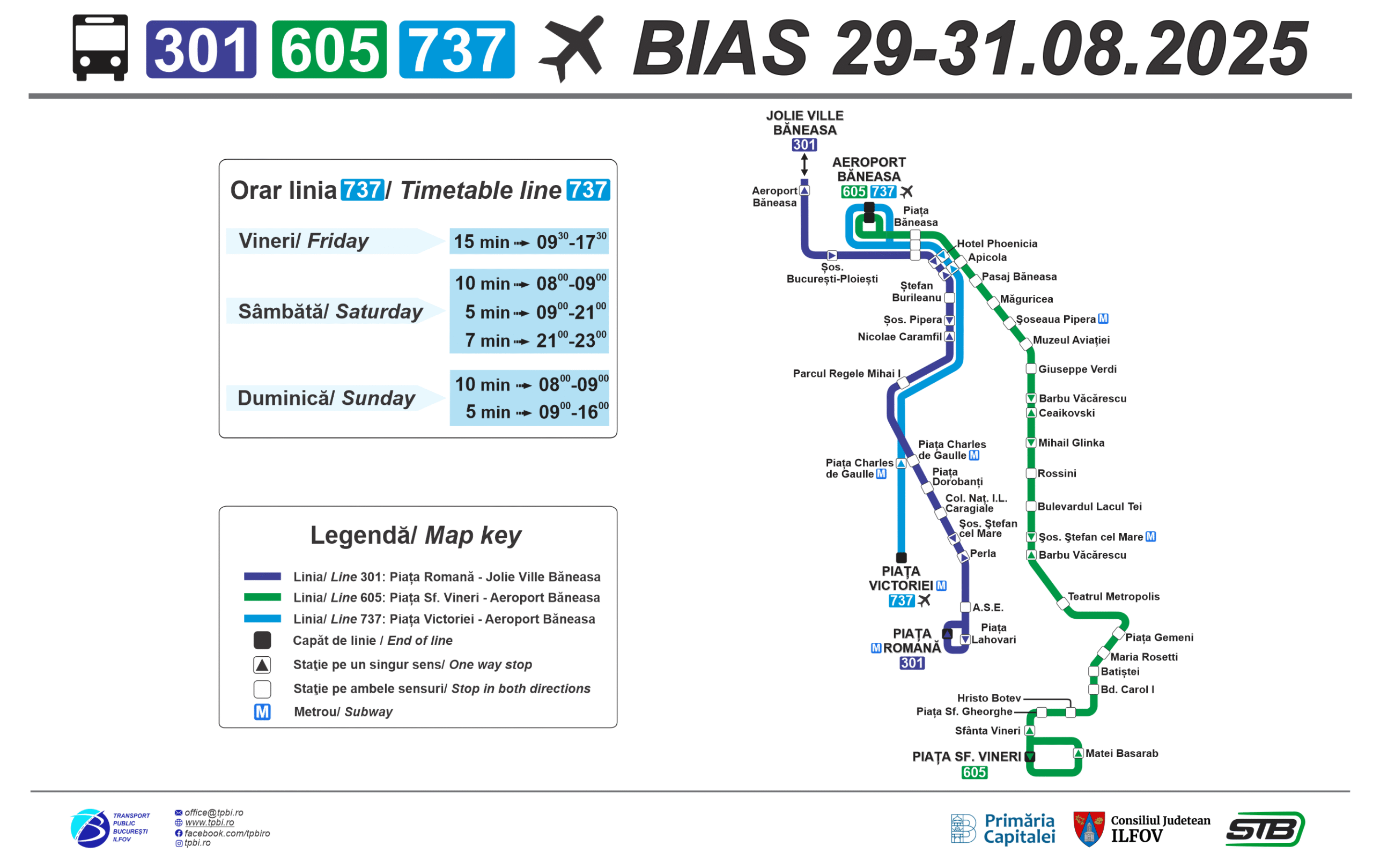 TPBI recomandă utilizarea transportului public pentru evenimentul BIAS 2025: linia de autobuz 737 (Piața Victoriei – Aeroport Băneasa) și linia 605, care va avea parc suplimentat.