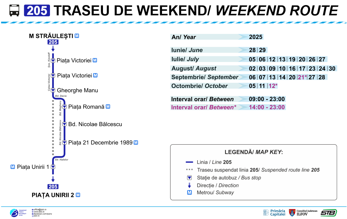 Autobuzele liniei 205 vor circula pe un traseu modificat prin Bulevardul Dacia în fiecare weekend din perioada 28 iunie 2025 – 12 octombrie 2025, ca urmare a desfășurării evenimentului ”Străzi Deschise – București, Promenadă Urbană”.