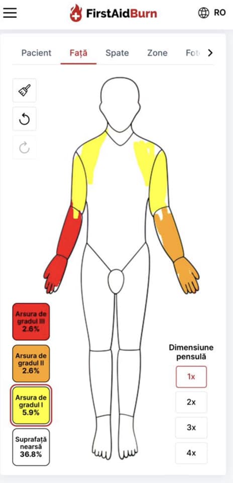 - A doua problemă e legată de tratamentul în primele 24 de ore. În cazul pacienților arși tratamentul in primele 8 ore si apoi in primele 24 ore e foarte important pentru stabilizarea hemodinamică. În funcție de suprafețele arse, de gradul arsurilor si de vârsta pacientului sunt niște algoritmi in funcție de care se calculează volumul de lichide care trebuie administrate intr-o prima faza. Din câte mi s-a explicat, o problema des întâlnită, este administrarea unui volum mai mic de lichide față de cât ar trebui. Pentru a rezolva această problemă, aplicația permite medicului să deseneze cu degetul sau cu mouse-ul pe ecran arsurile pacientului și apoi calculează automat volumul de lichide care trebuie administrat și suprafețele arse pe fiecare parte a corpului. E putin mai complicat pentru că algoritmii sunt diferiți pentru nou-născuți, copii și adulți, dar sunt suportate toate scenariile. Pentru specialiști: sunt suportate si Parkland si Galveston-Carvajal și sunt folosite tabele Lund-Browder pt calculul cat mai precis al suprafețelor arse.