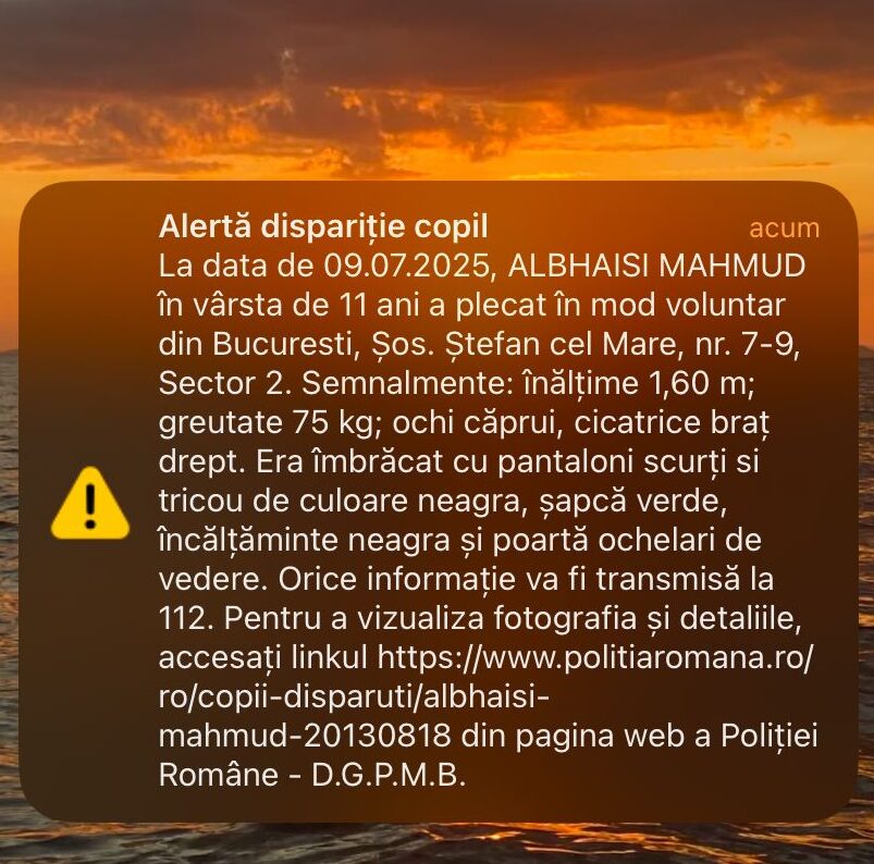 „La data de 9 iulie 2025, Poliţia Capitalei a fost sesizată cu privire la dispariția unui minor, care a plecat în aceeași zi, în jurul orei 19.00, de la o adresă din Sectorul 2 și nu a mai revenit până în prezent la adresa de domiciliu, situată în același sector”, anunță Poliția Capitalei, într-un comunicat.