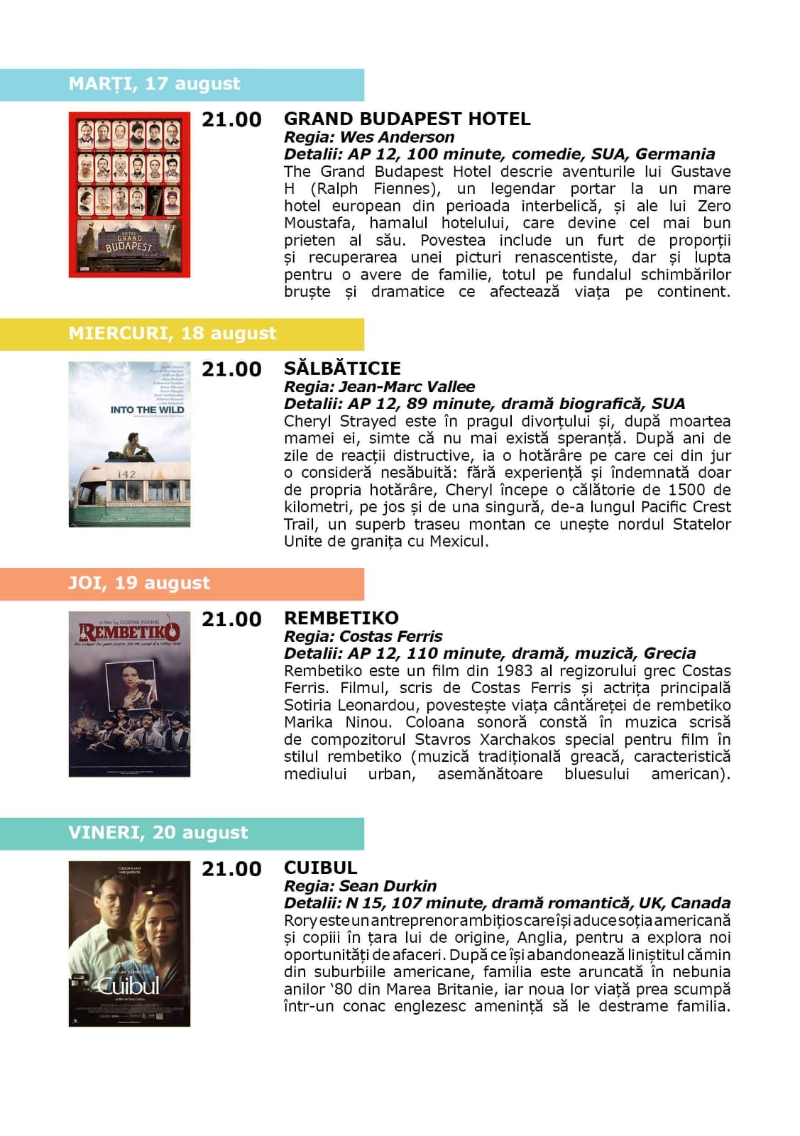 Evenimentul aduce anul acesta pe marele ecran 20 de filme, dintre care 6 filme noi în Selecția oficială – program care în fiecare an reunește cele mai apreciate filme lansate în ultimul an, laureate la Cannes, Berlin, Veneția sau Oscaruri – 4 filme în secțiunea Focus Wes Anderson, 5 filme îndrăgite în Retrospectiva Muzica și Marea, și 5 filme în Retrospectiva Filmului de aventuri, cele două retrospective aducând în atenția publicului titluri mai vechi, pe care cinefilii nu au avut ocazia să le urmărească pe marele ecran.
