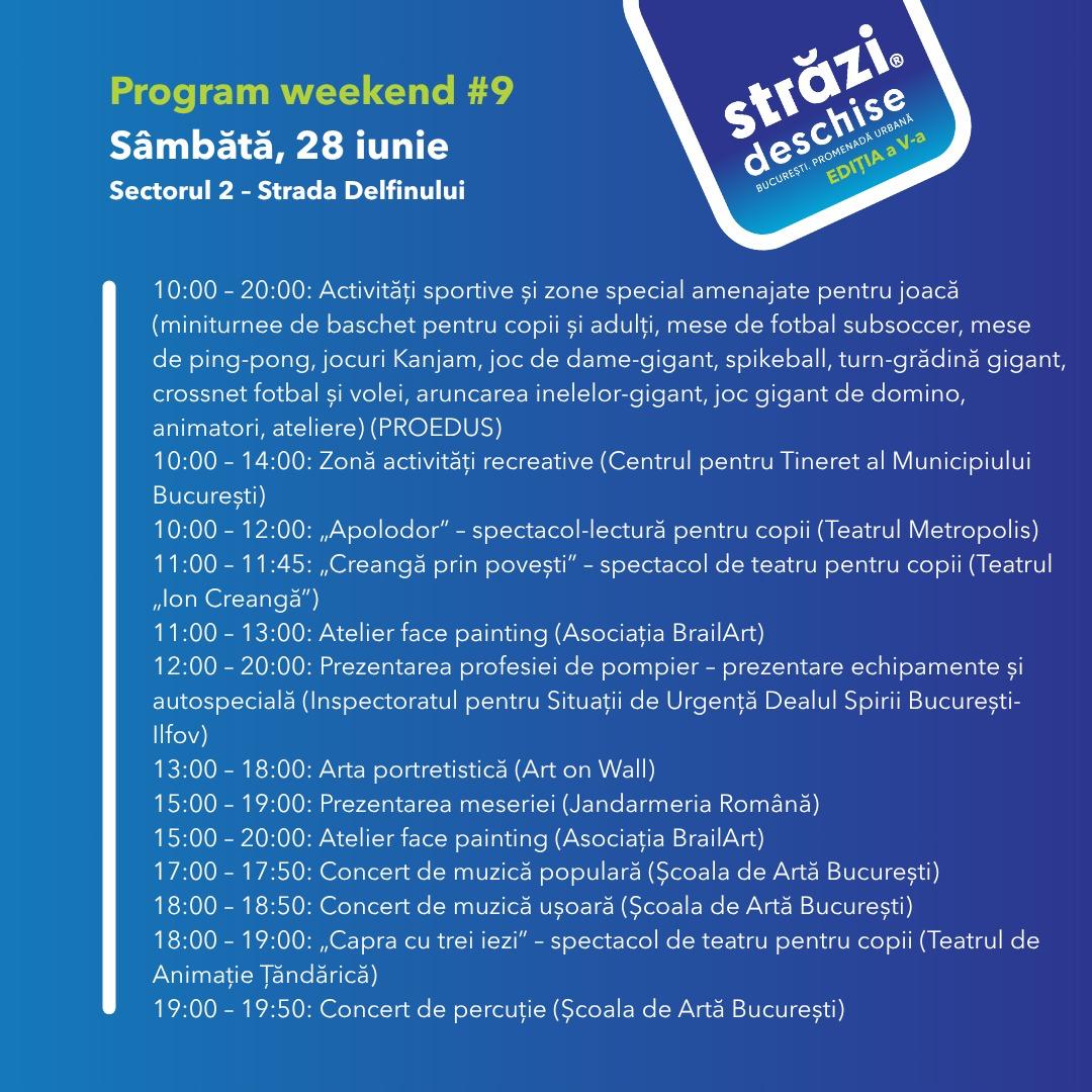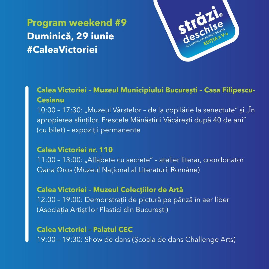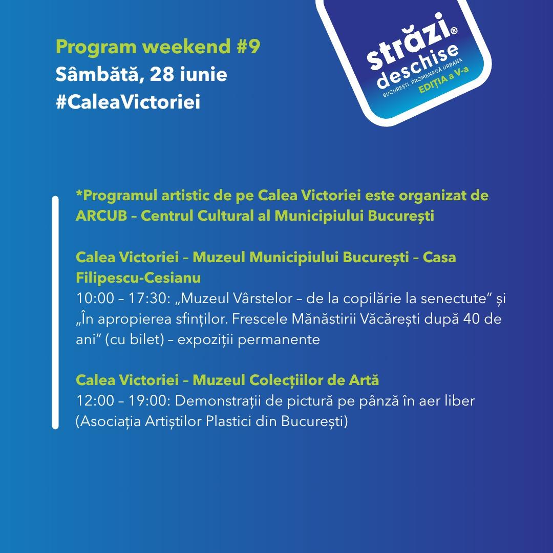 În cadrul programului „Străzi Deschise – București, Promenadă urbană” din acest weekend, Calea Victoriei devine pietonală în zilele de 28 și 29 iunie, între orele 10:00 și 22:00, pe segmentul de drum cuprins între Bulevardul Dacia până la intersecția cu Splaiul Independenței, fără afectarea intersecțiilor. Se va permite traversarea pe Calea Victoriei, pe strada Știrbei Vodă, strada C.A. Rosetti, strada Dem I. Dobrescu, strada Ion Câmpineanu, bulevardul Regina Elisabeta. Traficul Societății de Transport București va fi deviat, fără afectarea călătorilor. Traficul rutier pe Calea Victoriei se reia pe timpul nopții până dimineața (în ziua de sâmbătă spre duminică), începând de la ora 23:00 până la ora 09:00. Pentru siguranța participanților la eveniment, pe arterele pe care nu mai circulă mașini se închid și pistele de biciclete.