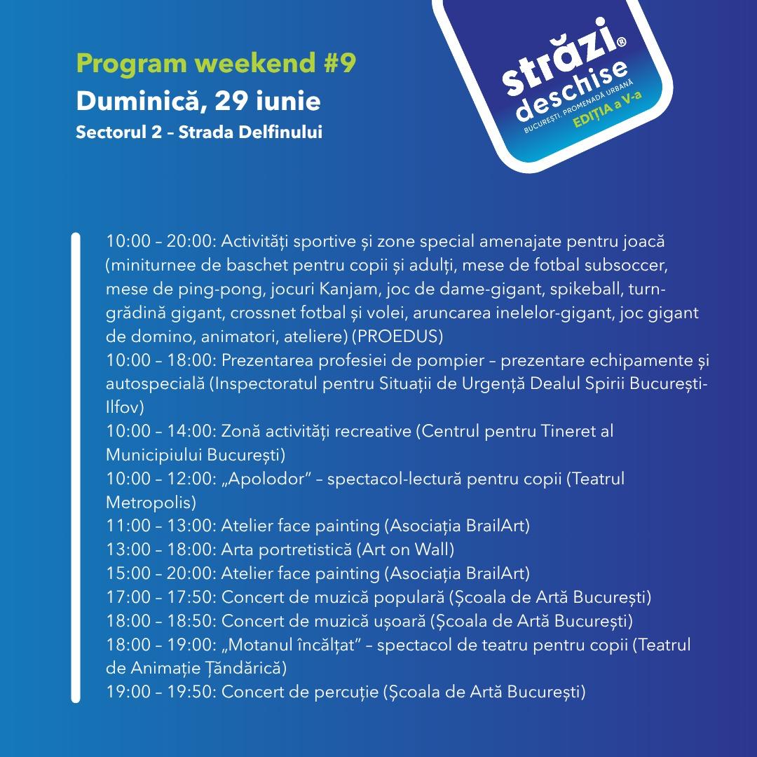 În ultimul weekend din iunie, „Străzi deschise – București, Promenadă urbană” aduce din nou orașul mai aproape de oameni pe Calea Victoriei și Strada Delfinului (Sectorul 2). Programul din 28–29 iunie cuprinde activități pentru copii, spectacole de teatru, expoziții, demonstrații artistice și experiențe creative în aer liber. Vezi mai jos programul pe zile!