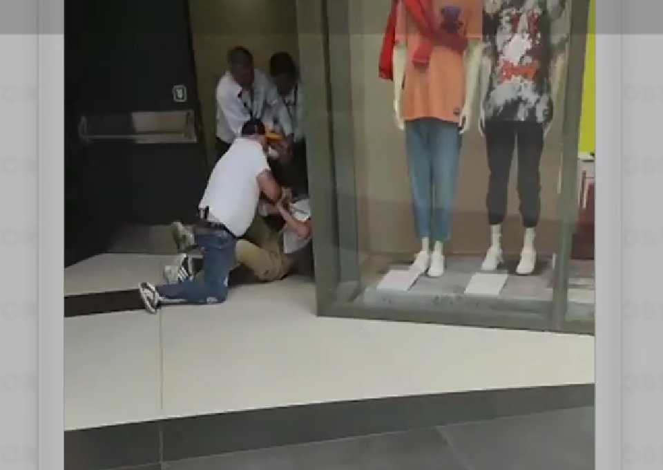 În imaginile trimise de un martor pe Fii observator se vede mai cum tânărul este obligat să intre într-o anexă a centrului comercial.