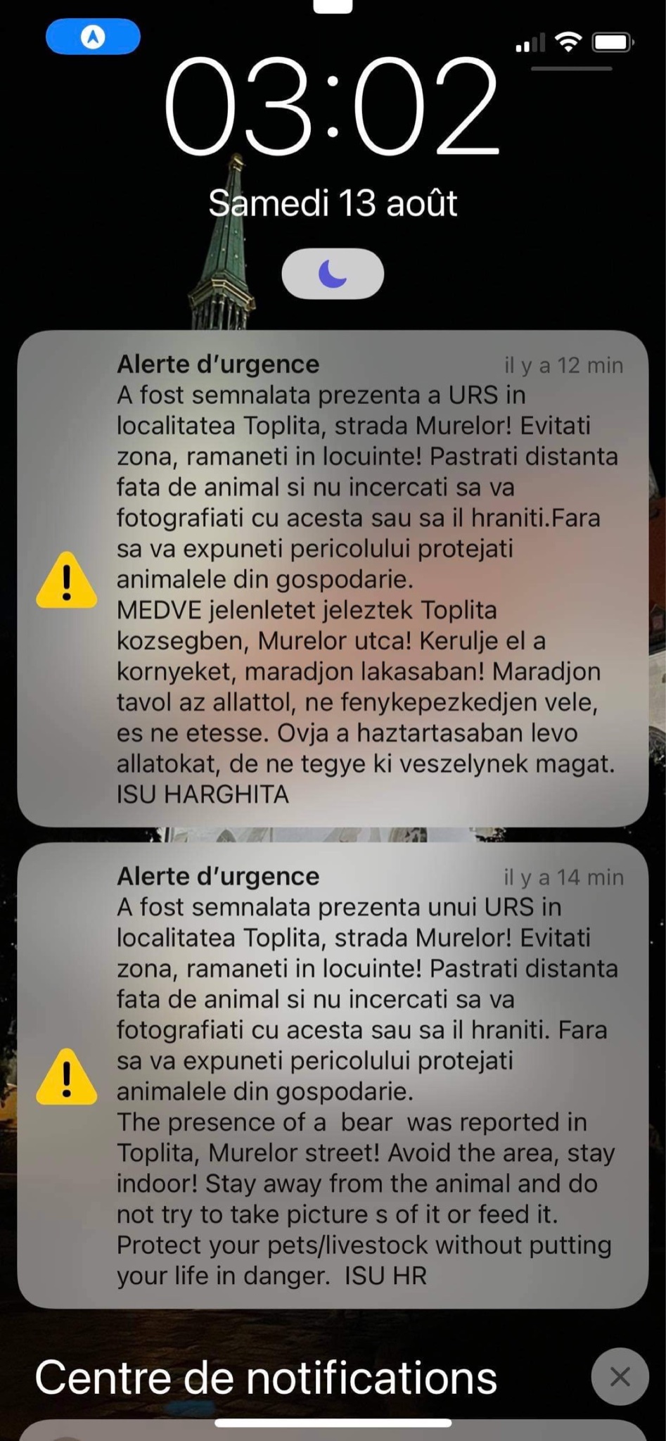 Un text în română acompaniază alarma. Treziți forțați, citim, cumva, că URSS este prezentă în Toplița în timp ce dormim și trebuie să evităm Strada Murelor (unde am stat cu o seară înainte) pentru a nu ne pune viețile în pericol”, povestesc cei doi.