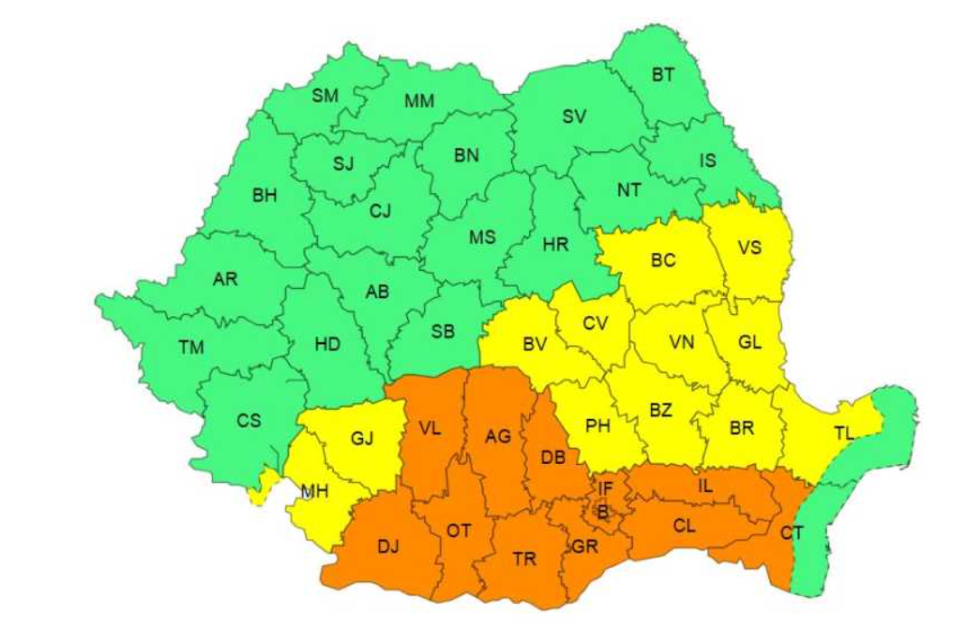Administrația Națională de Meteorologie (ANM) a emis, vineri, o nouă avertizare Cod portocaliu de caniculă, valabilă până sâmbătă dimineața în 13 județe și în București, precum și un Cod galben căldură persistentă, ce vizează alte 12 județe, arată Agerpres.