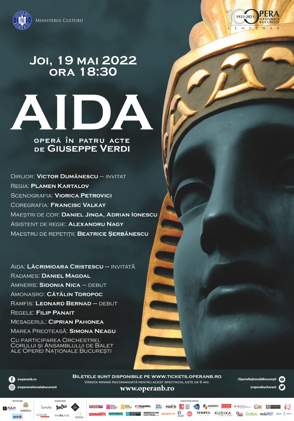 Distribuția reprezentației: Aida – Lăcrimioara Cristescu (invitată), Radames – Daniel Magdal, Amneris – Sidonia Nica (debut), Amonasro – Cătălin Toropoc, Ramfis – Leonard Bernad (debut), Regele – Filip Panait, Mesagerul – Valentin Racoveanu, Marea Preoteasă – Simona Neagu. Cu participarea Orchestrei, a Corului și a Ansamblului de Balet al Operei Naționale București.
